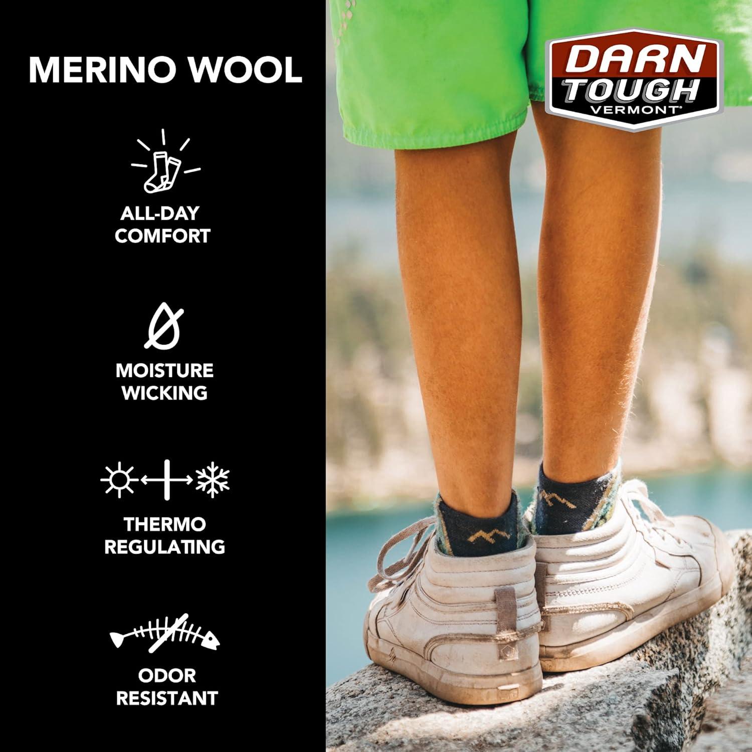 Darn Tough Vermont boys' crew socks are designed to keep up with the most active lifestyles, providing unmatched comfort, durability, and performance. These crew socks for boys feature a performance fit that prevents slipping, bunching, and blisters, ensuring maximum comfort during hikes, sports, or everyday activities. Made with 45% Merino Wool, 52% Nylon, and 3% Spandex, these boys athletic socks naturally keep feet fresh, dry, and no odor in any weather. The lightweight design and multi-zone mesh panels enhance breathability and flexibility, making these boys sports socks a must-have for summer hiking and outdoor adventures. Proudly made in the USA at Darn Tough’s Vermont-based mills, these youth boy socks are crafted with meticulous attention to detail for all-weather performance. Measuring 6 inches from heel to cuff, the crew socks kids rise just above youth hiking boots or low hiking shoes, offering ideal coverage and protection. Built to withstand tough conditions, these boys youth socks are great for school, sports, and play. Whether your child is tackling the trail or heading to practice, these socks boys can handle it all with unmatched comfort and durability.