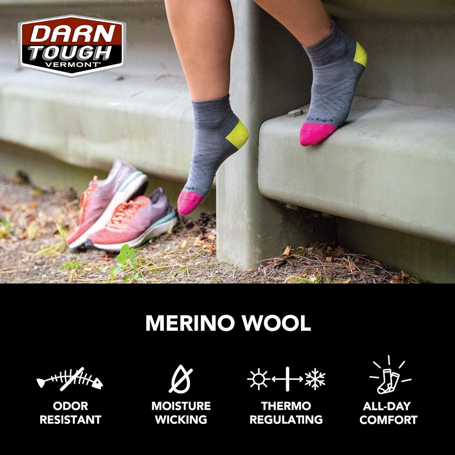Run with confidence in the Darn Tough Women's Quarter Ultra-Lightweight with Cushion Running Sock. These women's socks offer a feather-light feel with a touch of cushioning beneath your feet for added comfort. The quarter height sits just above your ankle—perfect for low-cut hiking shoes or running sneakers. True Seamless technology means no annoying seams rubbing against your skin, providing a smooth and irritationless fit for every stride. Crafted from 50% Merino Wool, 45% Nylon, and 5% Spandex, these socks keeps your feet dry and fresh during workouts or long runs. The breathable Merino Wool adapts to weather, keeping you cool in summer heat and warm in winter chill. Designed for runners and hikers who need performance and durability, these socks are made in Vermont, where quality meets tough terrain. Whether you're chasing a new goal or heading out for a casual jog, they’re built to keep up.
