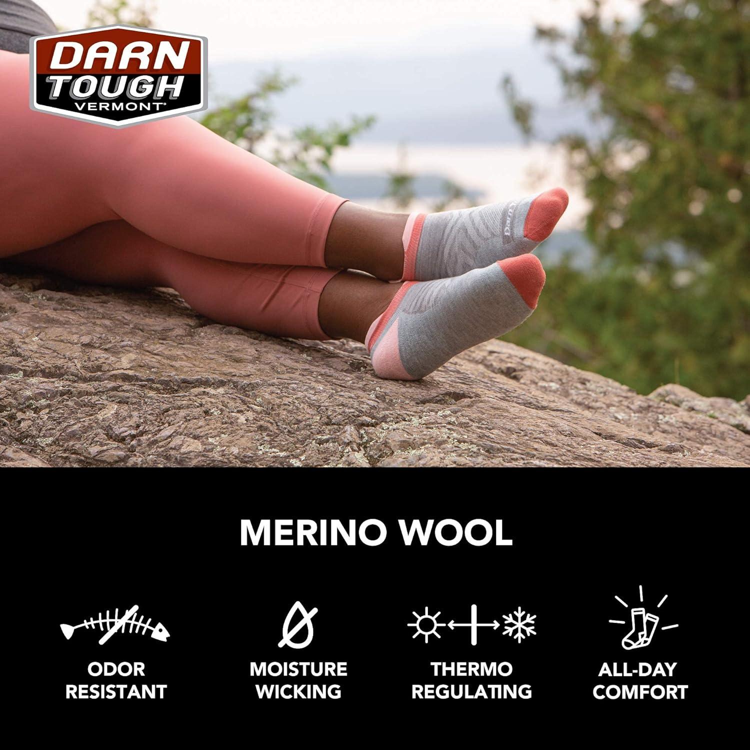 Stay comfortable in any condition with the DARN TOUGH Women's Hiker/Trek Quarter Socks. Designed with midweight cushioning, these quarter socks for women provides warmth and support where it’s needed most, making them perfect for outdoor adventures and everyday wear. The mid-level cushion density underfoot provides a balance of comfort and durability, while True Seamless technology limits irritating seams for an ultra-smooth, invisible feel. The quarter length socks sit just above the ankle, offering a “just right” height that works seamlessly with low-cut hiking boots or running shoes for fast and light movement. Crafted with a blend of 59% Merino Wool, 39% Nylon, and 2% Spandex, these women’s quarter socks are soft, breathable, and built for all-weather performance. Merino Wool component keeping feet dry and odorless, while its natural temperature-regulating properties ensure you stay cool in the summer and warm in the winter. Whether you’re hitting the trail or heading out for a run, the quarter socks women love are knit in Vermont, USA, combining expert craftsmanship with unparalleled comfort and style.